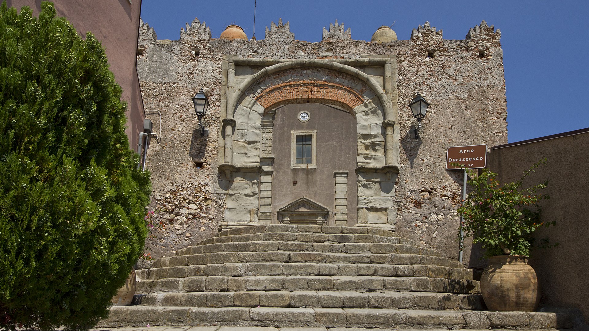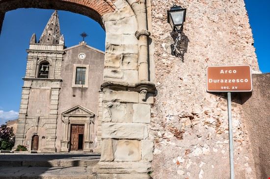 L’Arco Durazzesco: si raggiunge tramite una suggestiva scala semicircolare in pietra, una strada magica che conduce in una piazza tra le più belle della località con vista sull’abitato e sulla Baia di Taormina. La Porta Durazzesca prende il nome dalla città albanese di Durazzo, sulla quale la Famiglia Angiò esercitava la propria signoria.